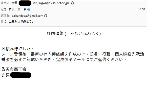 「社内連絡」という題名で、個人情報を取得するため返信を促す内容となっておりますが、当商工会では、電子メール等での情報収集は行っておりません。